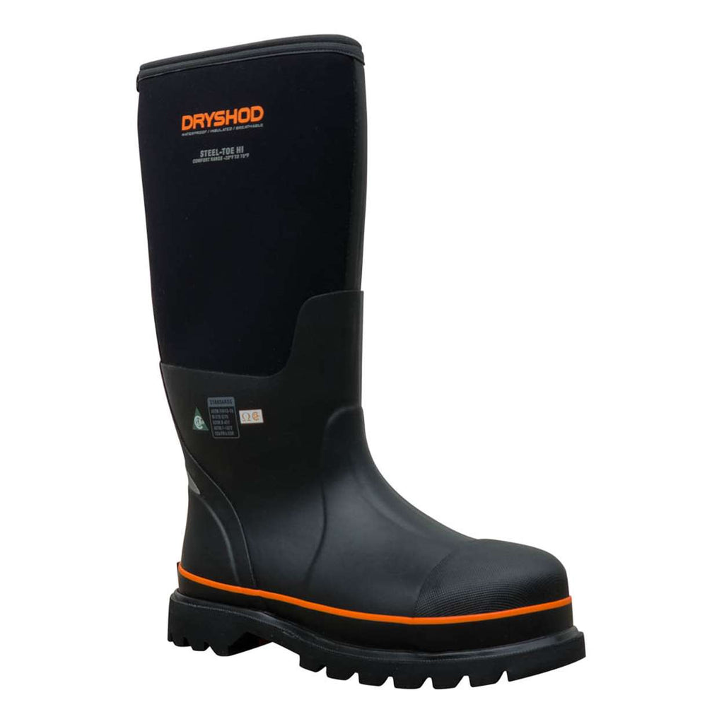 Stay safe and comfortable all day with the Dryshod Steel Toe CSA Unisex Protective Work Boot. This steel-toe boot includes a solid rubber outsole for traction and durability, strong triple-layer toe and heel reinforcements, and orange treatments to signify safety. With a detachable molded EVA sockliner and steel shank for extra arch support, this unisex boot provides all-day comfort and protection no matter how hard the labour.